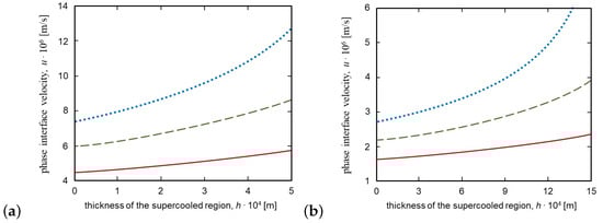 The numerical solution of this equation determines h, which is shown in Figure 3, in accordance with the material parameters from Table 1 for Ti-Al and Al-B melts. As can easily be seen, the thickness h of the supercooled layer increases with the increase in the phase interface (crystallization) velocity u and the decrease in the temperature gradient . In addition, for the Al-B melt (), the lower crystallization velocity u leads to a higher thickness h than for the Ti-Al melt () due to higher impurity displacement by the phase interface ( for the Al-B melt is higher than for the Ti-Al melt, and, therefore, the thickness h of its supercooled region is also higher).