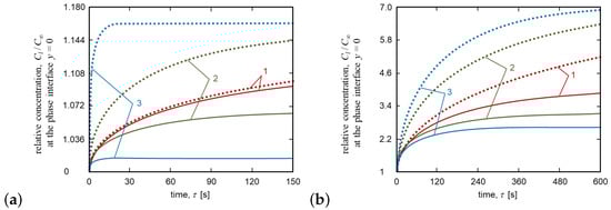 Generally speaking, three scenarios of directional crystallization can occur. (i) The constitutional supercooling condition (4) is not satisfied at all times, and the system crystallizes with a planar interface. (ii) Constitutional supercooling condition (4) is satisfied at a certain time so the binary liquid crystallizes with a planar interface at and a mushy layer (discontinuity interface) at . (iii) Constitutional supercooling condition (4) is always satisfied at , and the system crystallizes with a mushy layer (discontinuity interface) at all times. The last crystallization scenario corresponds to curves (2) and (3) in Figure 4a. The rest curves illustrated in Figure 4a,b correspond to case (ii).