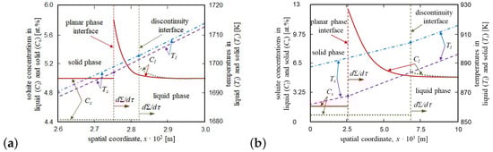 Figure 5 illustrates the solute concentration and temperature in the liquid and solid phases for both cases under consideration (solid lines demonstrate the solute concentration for a planar phase interface, while dotted lines show the concentration for the discontinuity interface mimicking a mushy layer). First of all, we can see that the liquid–solid interface moves faster in the case of mushy layer formation (compare the vertical green and red dashed lines). As this takes place, the solute concentrations in the liquid and solid phases become lower, while the temperatures in these phases become higher. Note that the difference between the concentration distributions increases as the heat removal into the solid phase increases (as the temperature decreases). In addition, the presence of the mushy layer causes redistribution of impurity in the solid material due to mass transfer processes. Namely, the impurity displacement by the solid phase into interdendritic interstices and merging of branching dendrite-like structures can lead to the formation of impurity-rich liquid phase regions in the mushy layer and modify the structure and properties of a crystallized material.