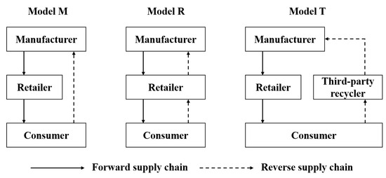 To investigate the impacts of a market-driven DRS on recycling processes and pricing strategies within a CLSC for WEEE, we propose three distinct recycling frameworks: (1) the electronics manufacturer establishes its own recycling channels (model M); (2) the electronics retailer undertakes the recycling activities (model R); and (3) a third-party recycler is responsible for the recycling operations (model T). Furthermore, within the Stackelberg Game framework, among supply chain members, the electronics manufacturer assumes the role of the leader, while the electronics retailer and the third-party recycler act as followers. The recycling models of the CLSC are illustrated in Figure 1.