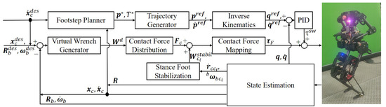In this paper, we optimized both step location and timing in the high-level planner and combined it with the above controller to control the robot. The whole control scheme is shown in Figure 1. In this figure, , , , and are the desired values of the CoM position, velocity, base orientation, and angular velocity, respectively. The footstep planner derives the optimal foothold position and step duration based on the desired CoM velocity and feedback information, including the actual CoM position , velocity , and the stance foot rotation matrix . Then, the swing leg foot trajectories and are calculated. These trajectories are the input for inverse kinematics to compute joint references and . A Proportional–Integral–Derivative (PID) controller is used to generate the corresponding joint torque , driving the actual joint position and velocity to follow the joint references. For the low-level controller, the virtual wrench is generated based on the error between the desired CoM and base values and the actual CoM position, velocity, base orientation , and angular velocity . The contact force distribution optimizes the contact force at each predefined contact point. This also adds the contact foot stabilizing wrench , which is based on the stance foot velocity and angular velocity . Finally, the contact force and stabilizing wrench are mapped to derive the joint torque , which is combined with and sent to the robot.