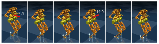 The balance task is the most fundamental task for a bipedal system; thus, we first tested the capability of the controller to maintain balance under external disturbances. In the first simulation, the desired linear and angular velocities in Equation (9) were set to , and an impulsive force was then exerted at the base in the positive x direction (7 N), followed by in the positive y direction (14 N). Figure 3 displays snapshots of the simulation and the results are shown in Figure 4. The push force is the maximum force in each direction with a fixed duration (0.1 s), and we can see that the robot could recover to its initial position within one second. The reason why the y direction can resist larger forces is that the support polygon has a larger width than length because of the short feet.