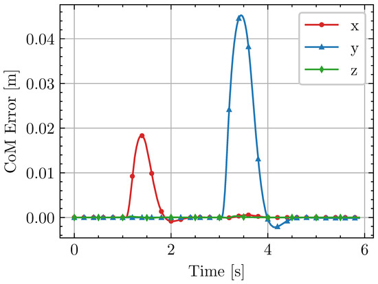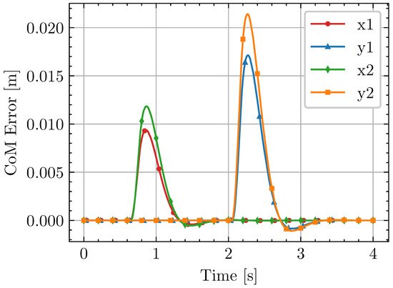 Simulation results of push recovery in the x and y directions. The figure shows the time history of CoM error with respect to its initial position in each direction.