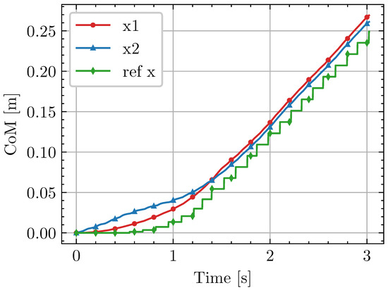 Comparison of CoM tracking in the x direction between our method and the dynamic model-based method. x1 represents our method, x2 denotes the dynamic model-based method, and ref x means the command.