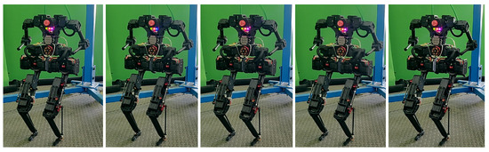 - Shen, J.; Zhang, J.; Liu, Y.; Hong, D. Implementation of a Robust Dynamic Walking Controller on a Miniature Bipedal Robot with Proprioceptive Actuation. In Proceedings of the 2022 IEEE-RAS 21st International Conference on Humanoid Robots (Humanoids), Ginowan, Japan, 28–30 November 2022; pp. 39–46. [Google Scholar] [CrossRef]
