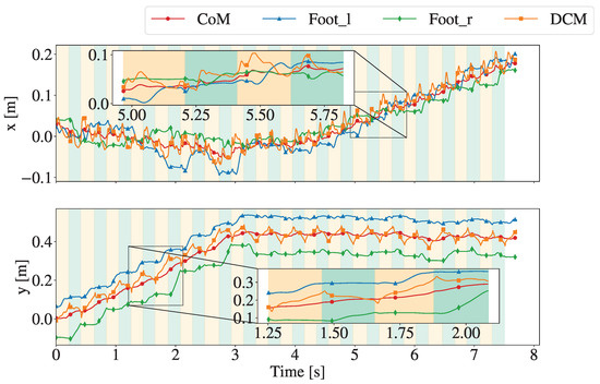 Experiment results of omnidirectional walking. The trajectories of CoM, left foot, right foot, and DCM are presented. The blue stripes represent the left stance phase, while the orange stripes represent the right stance phase.