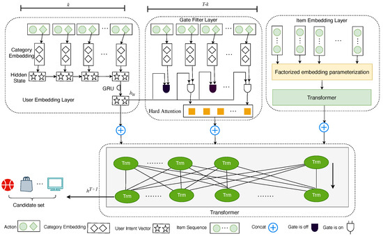 Specifically, we have the sequence with its corresponding category sequence , where denotes the category corresponding to the i-th item in the sequence and T denotes the last index. By mapping transformations, we can obtain the embedding of the category sequence , where . We input this sequence of categories into the structure composed by the GRU to obtain the user embedding representations. The nodes of the GRU are updated as follows: