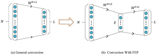 The number of items is often in the thousands, and their item IDs are usually labeled in the integer domain using one-hot encoding, which greatly increases the number of parameters in the model. So, we first map the one-hot encoding to a low-dimensional embedding vector to reduce the dimension and improve the representation learning ability of the model. We denote the size of the dataset as and the dimensionality of the embedding vector as d such that the number of parameters the model needs to learn can be represented as . It should be noted that here we use factorized embedding parameterization [16] to further reduce the number of parameters in the model, which helps in expanding the model’s capabilities. In simple terms, embedding factorization means adding another layer to the original mapping matrix. Assuming that the added embedding dimension is E, the number of parameters is , and if , the reduction in the number of parameters is obvious. Thus, the project embedding can be expressed as . The factorization is schematically shown in Figure 2.
