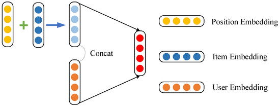 To make full use of the hidden layer information in user representations, we choose to add it to the Transformer layer for joint learning. The vector combination process is shown in Figure 3. First, add the item embedding and the position embedding to obtain . Then, is spliced with the user embedding u and linearly transformed to obtain the final input embedding for the model.