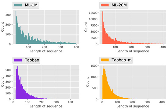 We apply the same preprocessing operation [40] to all datasets, keeping columns corresponding to users, items, and categories. The entire dataset is ordered by user and timestamp. Figure 6 shows the sequence length distributions of the four datasets. It can be seen that the categories in the MovieLens datasets are fewer, and the average user interaction lengths are longer. The two sub-datasets of Taobao contain more categories, and the user interaction sequences are much shorter compared to the other two datasets.