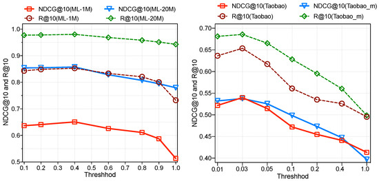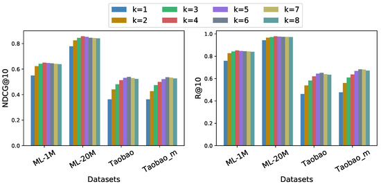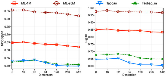 The effect of the implicit dimension of user embedding is shown in Figure 9. NDCG@10 and R@10 were evaluated as the implicit dimension was increased sequentially from 8 to 512. It can be observed that the NDCG@10 values were better across all four datasets when the implicit dimension was small. As increased, the overall model performance tended to decrease, probably because of the following: (1) The number of item categories was limited, and the information learned by the model in larger dimensions was more sparse. (2) The input of the Transformer was the vector from the splicing of the item embedding and the user embedding. In larger dimensions, the user embedding may bias the learning of the model toward the user embedding, thus affecting its ability to model the item sequence.