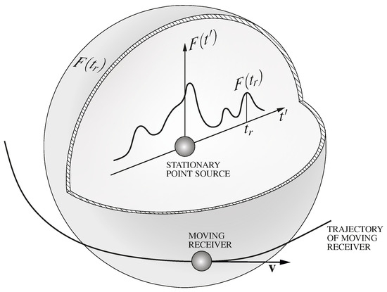 Modifying any of these moving point source solutions to accommodate a moving receiver results in a violation of the ordinary wave equation. For example, if the receiver starts to move, then its position becomes a function of time, i.e., . As will be demonstrated later in this paper, if one substitutes by in Equation (2), then u is no longer the solution to the ordinary wave equation. The same applies to the acoustic point source solutions mentioned in references [20,21,22].