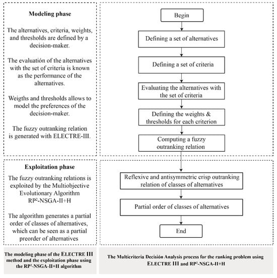 Two phases are distinguished when approaching decision problems from the perspective of outranking relations: modeling and exploitation. Both phases can be performed with a decision-maker or a group of decision-makers. When a group of decision-makers is included in the modeling phase, it can be sequential or parallel and synchronous or asynchronous. The objective in a group decision-making process is to obtain consensus in the process and results. It is possible to address multi-criteria group decision ranking problems using a computational system like that presented in Leyva et al. (2017) [30]. Regardless of whether the decision process includes one or more decision-makers, in the modeling phase, the decision-maker’s preferences are modeled on criteria that evaluate alternatives.