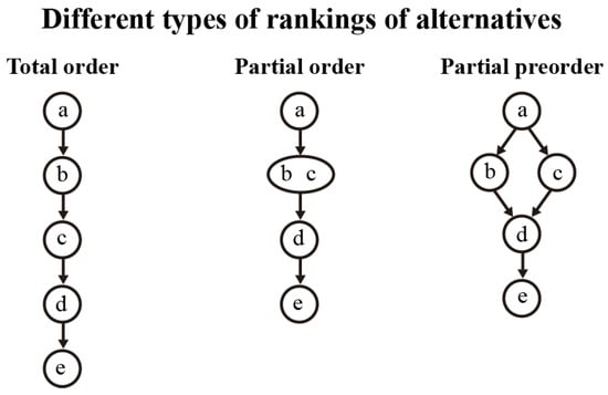The comparison between pairs of alternatives in the fuzzy outranking relation allows for the generation of an ordering of said alternatives in the exploitation stage. In the multi-criteria ranking problem, three types of orders can be presented: (i) total order, (ii) total preorder, and (iii) partial preorder, which are presented in Figure 3.