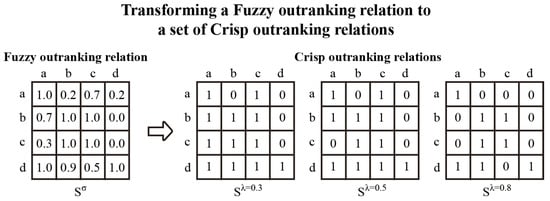 When exploiting a fuzzy outranking relation Sσ, it is usually transformed into a crisp outranking relation Sλ. A crisp relation can be defined with a function that assigns the value 1 to the ordered pairs in the relation and 0 to those not in the relation. To define whether an ordered pair (a,b) ∈ A × A; a,b∈A; is in the relationship, a cut-off level λ→[0, 1] is defined, also known as the credibility level. A cut-off level can be seen as a minimum or demanding level regarding credibility. Once a cut-off level is defined, the level of credibility of any pair of alternatives can be known, that is, Sλ(a,b) = {1, if (a,b) ≥ λ; 0, otherwise}. Figure 4 presents the transformation of a fuzzy outranking relation to different crisp outranking relations based on various cut-off levels λ.