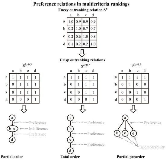 From the point of view of outranking relations between pairs of alternatives, i.e., indifference, preference, and incomparability, only the preference relation is present in total order. In a total preorder, the relations of indifference and preference are present. In the partial preorder, the relations of incomparability and preference are present, as well as the relation of indifference. Figure 5 exemplifies these preference relations in multi-criteria rankings as the cut-off level λ increases.
