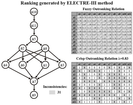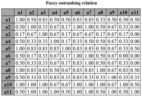 The fuzzy outranking relation was created using the ELECTRE III method (Bernard. Roy and Bouyssou, 1993) [45] using the alternatives, criteria, weights, and thresholds data from Table 2, Table 3, Table 4 and Table 5. The ELECTRE III method generates a concordance relation and, if veto thresholds have been defined, a discordance relation. Then, ELECTRE III generates the fuzzy outranking relation that is considered the integral model of preferences. This fuzzy outranking relation is used to know how an alternative is compared to another based on the relation “being at least as good as”. To generate a fuzzy overranking relationship using the ELECTRE III method, see Figueira, Mousseau, and Roy (2005) [46]. In this work, the OutrankingTools R package version 1.0 available in CRAN (2023) [47] was used to generate the fuzzy outranking relation.