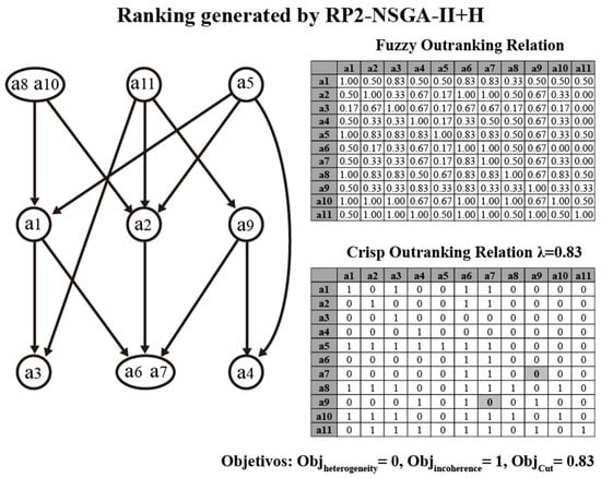 The use of RP2-NSGA-II+H to exploit Sσ instead of the ELECTRE-III distillation method was because the multi-objective evolutionary algorithm presented fewer inconsistencies between the generated ordering and the corresponding crisp outranking relation. It was known after analyzing the ranking of alternatives, which was automatically generated by the R OutrankingTools package version 1.0 after creating the fuzzy outranking relation with ELECTRE-III.