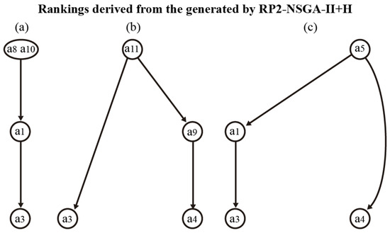 Based on the preferential relations contained in the fuzzy outranking relation to be exploited, RP2-NSGA-II+H H can generate a partial order of classes of alternatives (equivalent to partial preorders of alternatives), a partial preorder, or a total order. It is relevant because when using methods that can only generate total orders, e.g., the presented method in Leyva-Lopez and Aguilera-Contreras (2005) [32], there is a risk of obtaining rankings with multiple inconsistencies between the crisp outranking relation and said rankings. It occurs because these types of methods require the presence of preference relations to generate the ordering, which leads to inconsistencies.