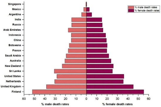 Male and female death rate (per 100,000) for countries with Alzheimer’s disease in 2023–2024 [3].