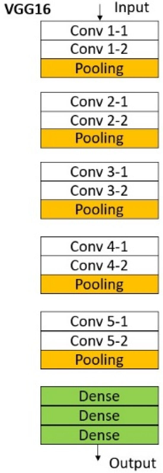 VGG16 is the most preferred CNN model used for the transfer learning approach to develop a predictive model for speeding up the training process trained on different datasets, and frozen to avoid information destruction. It has a uniform architecture with 138 million parameters. With the input of 224 × 224 × 3, it matches the neural networks and undergoes a series of multi-convolutional operations, and a max pooling stride of 2 with a size of 2 × 2 is present from a series of input to output layers. Size is proportionally reduced from 224 to 7. Table 4 shows the VGG16 layers and their pooling with dimensions. The benefit of using smaller multiple layers is that the activation function accompanies the convolutional layers in improving future network functions to converge quickly, which reduces the tendency to overfit during training. VGG16 has three fully connected layers, of which the first two layers have 4096 channels, the third layer has 1000 channels, and there are 13 convolutional layers.