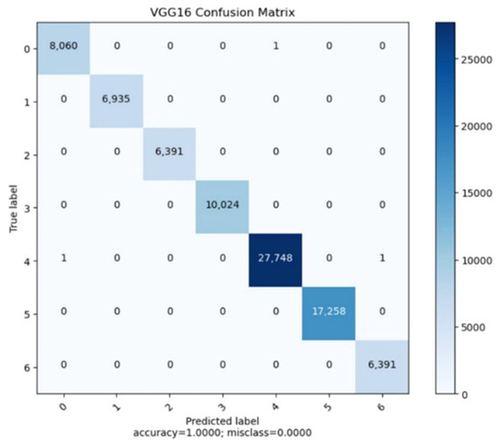 The VGG16 architecture in Figure 6 includes the input, convolutional layer, ReLU function, hidden layer, pooling layer, and fully connected layers. The input of 224 × 224 was used, and the model creators attempted to keep it constant by cropping the same from the center of each image. Convolutional layers used the smallest possible receptive field of 3 × 3, and 1 × 1 was used for linear transformation of input. ReLu (Rectified Linear Unit Activation Function) was for training time reduction, providing matching outputs for positive inputs and zero for a negative input, and activating the VGG network’s hidden layer. After convolution, to preserve spatial resolution, a convolutional stride of 1 pixel was used. Hidden layers used VGG rather than Alex Net because Alex Net increases the memory consumption and training time with the trade-off of a very low accuracy increase. The pooling layer was used to reduce dimensionality, reducing the number of available filters from 64 to 128, 256, and up to 512. Practical usage of VGG16 applies to image recognition or classification, image detection and localization, and image embedding vectors.