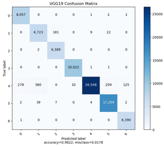 Pre-clinical Stage 1 is a starting stage, and Stage 6 is severe AD dementia. The need is to promote people by increasing the level of their sedentary life by either being physically active, allowing them to take part in social activities, having a healthy and balanced lifestyle and diet, or keeping their mind and body active. Diet and exercise for early symptomatic AD aim to maintain cognitive function through the intake of green leafy vegetables, proteins, and nuts; physical exercise. Cholinesterase inhibitors are used. Donepezil is used for Alzheimer’s treatment and can be detected through scanning techniques like CT (computer tomography) and PET (positron emission tomography) [29]. Predicted labels help classify and evaluate the model’s correctness and accuracy. Therefore, the model‘s performance was predicted through accuracy, precision, F1 score, and recall [30]. To analyze the key indicator metrics of models, we used a confusion matrix, which gave the correctness and incorrectness of the model. The true positives and negatives gave correctly predicted values, while the false positives and negatives gave wrongly predicted values. The generated training and testing confusion matrix over AD and healthy aging data in the US is visualized in Figure 9 for VGG16 and Figure 10 for VGG19, and Figure 11 displays the Alex Net confusion matrix. On training, the model accuracy was 99.9%, and on testing, the accuracy was 99.89%.