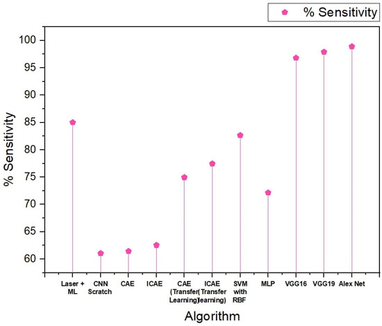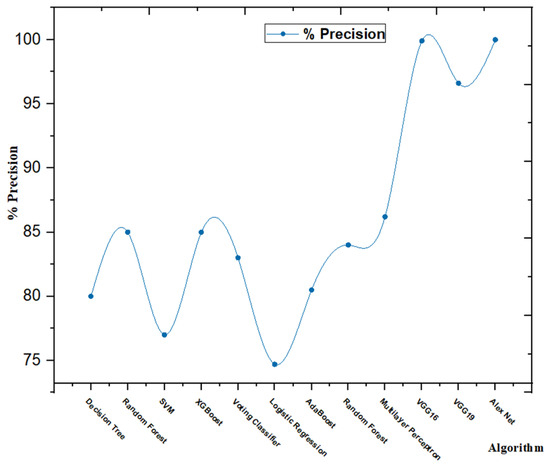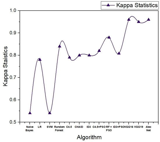 The proposed models for VGG16 had 0.96, 0.95 for VGG19, and 0.96 Alex Net outperformed when compared with the existing neural network and ML approaches for Cohen Kappa statistics. The Kappa statistics for various algorithms were compared with Naïve Bayes, Logistic Regression, SVM, C4.5, and CHAID from surveys [15,31] and are tabulated.