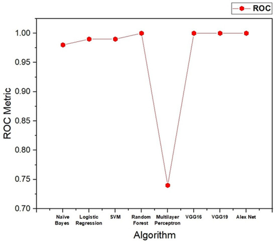 Receiver operating characteristic is abbreviated as ROC, used for the performance measure of classification modeled according to the tabulated values in Table 16 and using the graphical analysis in Figure 25. Between the true- (sensitivity) and false-positive rate (1-specificity) at numerous threshold settings, there was a trade-off. Under the ROC (area under curve) curve, if more area was covered, its model performance was better. The curve of the receiver operating characteristics was plotted by plotting true- and false-positive rates at diverse threshold levels. ROC for Alzheimer’s classification was compared using different algorithms shown in tabular form and compared with algorithms of Naïve Bayes, Logistic Regression, SVM, random forest, and MLP [11]. Equations (11) and (12) give the actual positive cases and actual negative cases correctly identified by the classifier.