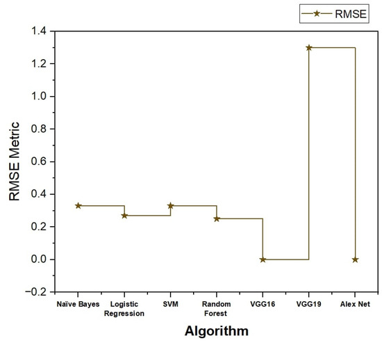 RMSE is the root mean square error used to measure accuracy metrics for a given regression model. The mean square error rate for Alzheimer’s disease classification was compared using different algorithms shown in tabular form [1] and compared with algorithms of Naïve Bayes, Logistic Regression, SVM, random forest, and MLP. The square root of an average of squared differences between the predicted and actual values, shown below in Table 17 and its graphical display in Figure 26, which only has a reduced value of 1.30%, has outperformed the existing approaches. The lower the RSME was, the better the regression model was in terms of accuracy.