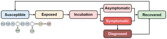 - Infectious. The agent can exhibit symptoms or progress to the asymptomatic stage after the end of the incubation period, self-isolate and become diagnosed [33], or recover.