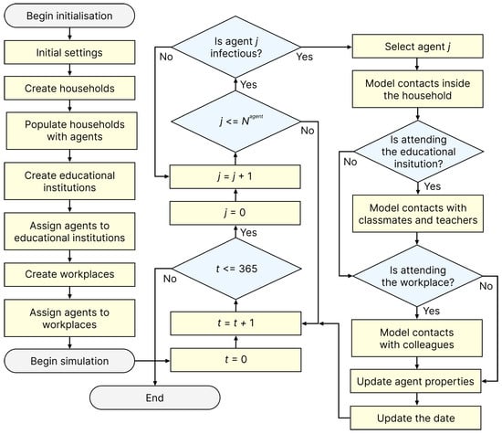 - We iterate over the agents, and if we find an infectious agent, we iterate over the agents with whom the agent makes contact with the current step. In the case of finding an agent, susceptible or partially susceptible to the virus, we sample the duration of their contact from a given distribution [29] and evaluate the risk of infection transmission. If the transmission is successful, the agent becomes exposed.