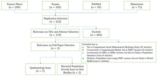 The screening was based on the relevance of each article’s title, abstract, and keyword, producing 119 related articles. Next, we employed manual filtering by reading the text thoroughly. The whole article can be read using the skimming method to obtain a comprehensive identification for selecting ODEs or DDEs for population dynamics in dental health issues. In addition, the skimming method was used to present a brief understanding of the selected articles. We obtained only three papers that matched our review protocol. The selected papers were divided into two issues, namely, epidemiology and bacterial population growth in oral biofilm. Moreover, we explored each article to gain information about the constructed model and its results. This also reveals the gap in exploring how we can develop mathematical studies for dental health issues. In brief, the selection process is shown in Figure 2.