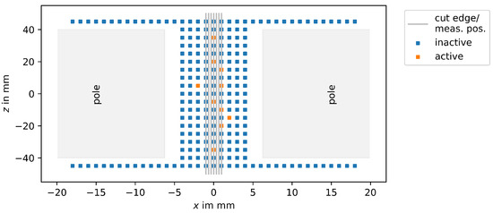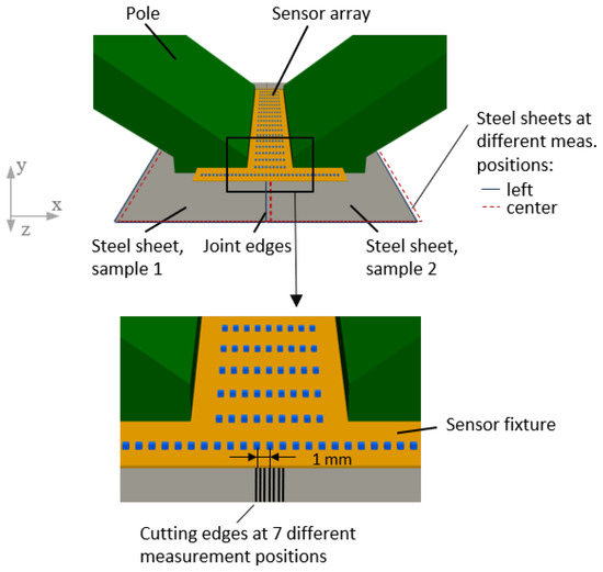 The magnetic field is captured by sensors, which are fixed to the sensor–actuator system. In order to increase the amount of data and thus improve the information gain and accuracy, the sensor–actuator system is positioned at different locations along the x direction, which means orthogonal to the cutting edge or the interface of sample 1 and 2, see Figure 2. This enables a higher resolution in the area of the cut edge, which cannot be achieved with the use of additional sensors due to their minimal size. Thus, data points are collected in a measurement series. To ensure consistency, the sheets will be demagnetized between each measurement position to eliminate any residual magnetism. This assumption is crucial for subsequent numerical simulations.