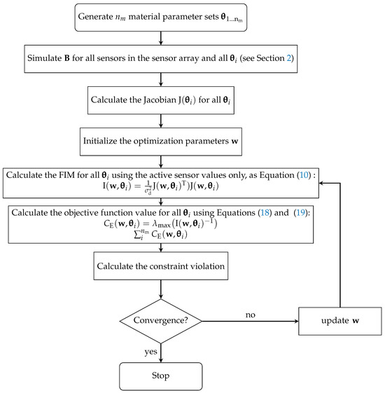 The optimal design of experiments (DoE) approach deals with the task of finding an optimal experimental configuration such that the reliability of the estimated model parameters is maximized. In the case at hand, this task simplifies to determining optimal sensor positions. As described in Section 3, a 2D sensor array is provided and each sensor can be active or inactive. Therefore, the optimization parameters are the binary weights , where is the number of sensors in the predefined sensor array. The number and the locations of the measurement positions are fixed and are not part of the parameter space.