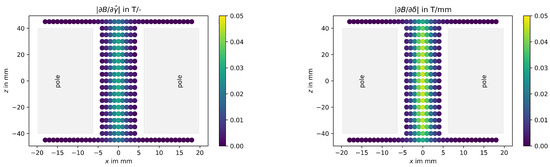 Absolute values of the sensitivities / for a material with the parameters (left) and (right) of all sensors between the poles along .