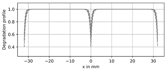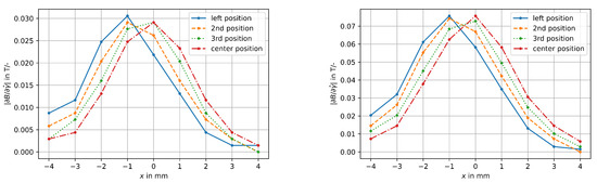 It can be observed that the sensitivities of the flux density are highly dependent on . If the degradation of the material is more flat, which means that the value is higher, the sensitivity with respect to increases and the other one decreases. This also means that there is a strong relation between both parameters. In any case, the sensitivities between the poles are dominant, and no effects from the outer cut edges are recognizable. The degradation curve already reaches the saturation value at a maximum distance of 10 mm, so the sheet width does not influence the result as long as it is greater than the pole distance. In Figure 7, the sensitivities of the sensors between the poles along the line are shown for different measurement positions. The left position is where the cut edges of the two samples are at , and the center position is at . The distance between the measurement positions is , and the distance of the sensors is . For better clarity, only the sensitivities of the measurement positions from the left pole to the center are shown; those on the right side are mirrored.