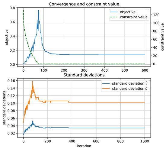 Convergence and constraint violation of the optimization problem as formulated in (22). Also, the standard deviations of the material parameter combination with the highest uncertainty values are shown.