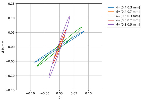 To show the dependency of the parameter uncertainty on the material parameter to be identified, the confidence ellipses of different material parameter combinations are plotted in Figure 10 using the optimized sensor configuration with .