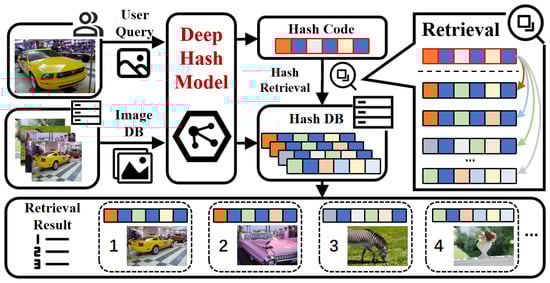 The idea of hash learning revolves around the process of mapping high-dimensional image data to low-dimensional hash codes while preserving both the semantic information of the image itself and the similarity between images. Existing hashing methods can be divided into shallow methods and deep-learning-based methods. Shallow methods [,,] learn hash functions by manually extracting image features. However, these methods are constrained by the limitations of the semantic description capability inherent in the features themselves, hindering their practical application effectiveness. In contrast, deep-learning-based methods have demonstrated notable advancements in image hashing. Deep-learning-based methods [,] leverage Convolutional Neural Networks (CNNs) to extract image features, followed by low-dimensional mapping using Fully Connected (FC) layers and the Sigmoid function. The overall model is then optimized through a loss function. Deep-learning-based methods can learn more discriminative hash codes through end-to-end training, thereby enhancing the performance of image retrieval. Figure 1 shows the workflow of deep-learning-based methods. As shown in Figure 1, deep hashing involves the conversion of all images into hash codes. The retrieved items’ hash codes are compared with the hash codes stored in the database and subsequently sorted based on the Hamming distance. The retrieval results are then returned accordingly.