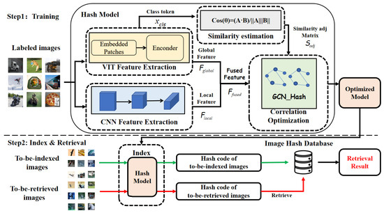 Currently, deep hashing methods predominantly rely on Convolutional Neural Network (CNN) as the image feature extractor, employing CNN to extract local features for low-dimensional mapping. With the emergence of Vision Transformer (VIT) [,,], VIT outperforms CNN in various computer vision tasks (image classification, object detection, etc.), and some studies [,,,] try to use VIT to replace CNN for feature extraction and achieve better results. However, existing approaches typically focus on utilizing a single type of feature (local or global) of the image for low-dimensional mapping. When using CNN to extract local features for low-dimensional mapping, the size of the receptive field limits the global representation ability of the generated hash codes. On the other hand, ViT models global dependencies through a self-attention mechanism and can effectively capture the global features of images. ViT has significant advantages in processing complex image structures and long-distance dependencies compared to CNN. However, this approach overlooks the local details of the image, diminishing the distinguishability between the foreground and background. Consequently, the sole use of any form of image feature negatively impacts the quality of the generated hash codes. Furthermore, existing models [,] primarily focus on correlation optimization through manually designed loss functions, without considering the reinforcement of correlation optimization at the model architecture level, which may not fully exploit the potential of model architecture-level enhancements. Due to the inherent limitations in considering all possible scenarios during the design of the loss function, certain situations are inevitably overlooked. And the loss function can only constrain the image similarity of pairs or triples and can only optimize the local data distribution relationship. Consequently, the distribution of the generated hash codes may significantly deviate from the distribution of data in the high-dimensional image space, leading to a decline in retrieval performance.