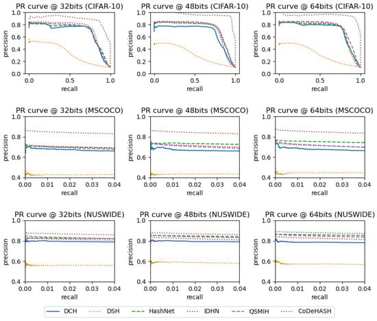 The PR curve for image retrieval using deep hash code of 32, 48, and 64 bits on three datasets.