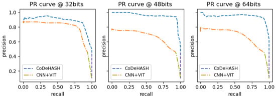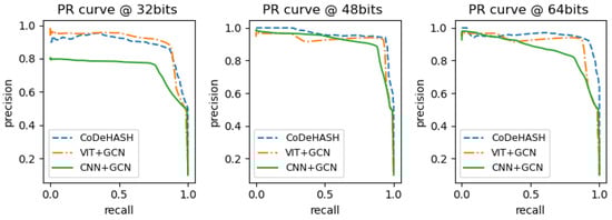 In addition, in order to test the effectiveness of GCN in the correlation optimization process, we conducted an ablation study without the GCN module (denoted as CNN+VIT) on CIFAR-10 for a comparative test. We report the experimental results with different correlation optimization setting in Table 4. Similarly, the value of mAP in each hash bit length setting significantly decreases. It is obvious that the mAP of 32 bits is much higher than the other lengths. The shortest length but the best effect proves that the model is very unstable without GCN for correlation optimization. We also present the corresponding PR-curve in Figure 6. Hence, we can demonstrate the effectiveness of our designed network.