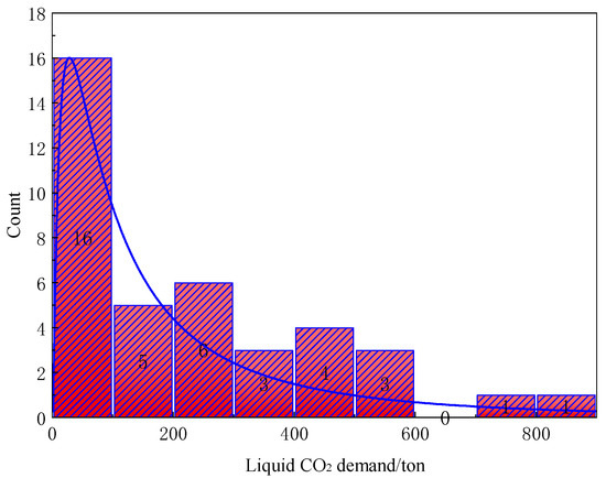 As a case study, this paper examines a major mine thermodynamic disaster incident that occurred at the Fuhua Coal Mine in Hegang City, China on 20 September 2008. The actual firefighting process consumed 825 tons of liquid CO2, with three suppliers capable of providing liquid CO2. The random demand for liquid carbon dioxide is treated as a random variable . Using the sample data of liquid CO2 demand from 39 historical accidents [27] (Table 2), the random liquid CO2 demand probability distribution and procurement risks for the Fuhua mine thermodynamic disaster are evaluated based on sample data, and procurement strategies are established based on decision-maker risk preferences to determine the optimal physical procurement quantity and capacity substitute reserves.