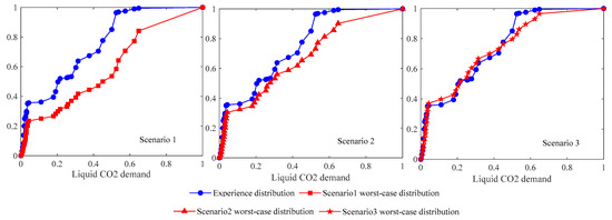 We can solve the optimization models of the above scenarios via the PSO algorithm. In the obtained results, the worst-case CVaR is shown in Table 5, and the worst-case distribution of liquid CO2 demand is as shown in Figure 4.