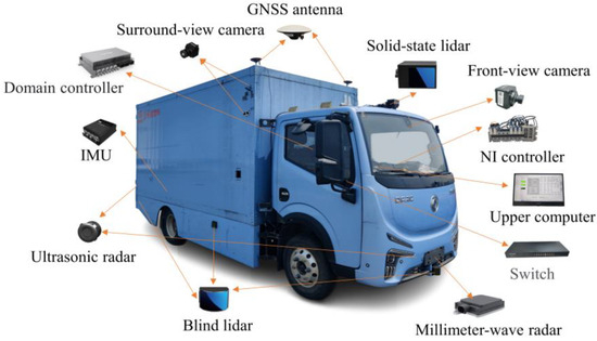 To ascertain the robustness and precision of the proposed algorithm, it was implemented on a real vehicle platform for testing, as depicted in Figure 2. The test vehicle employs the CGI-410 receiver from Shanghai Huace Navigation Technology Ltd. (Shanghai, China), which is situated at the center of the vehicle’s rear axle. The device boasts a gyroscope zero bias stability of 6°/h and an accelerometer zero bias stability of 0.02 mg, with data collection occurring at a frequency of 100 Hz. The lidar utilizes the CH128X1 from Shenzhen Leishen Intelligence System Co., Ltd. (Shenzhen, China) The device offers a horizontal scanning field of view of 120° and a vertical scanning field of view of 25° (with a resolution ranging from −18° to 7°), and data are gathered at a frequency of 10 Hz.