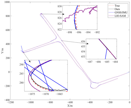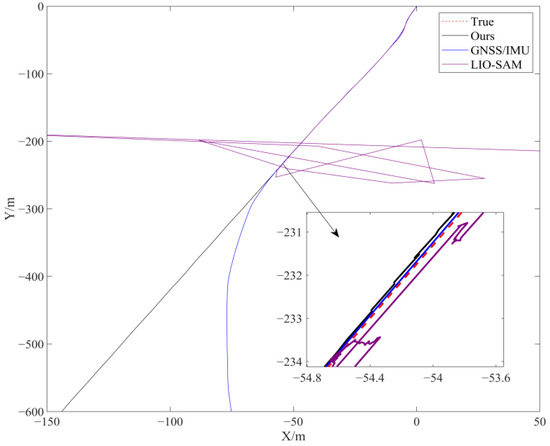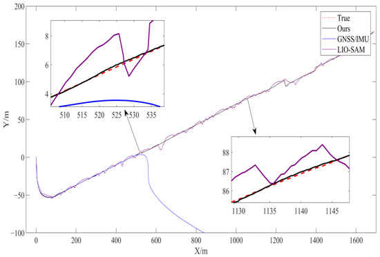 The global trajectories of the three algorithms are shown in Figure 7. When the vehicle drives under the viaduct, the GNSS/IMU algorithm also shows an increase in positioning error after a period of GNSS signal loss. The laser mileage calculation method of LIO-SAM has a large positioning error due to the mismatch of feature points under the viaduct with dense traffic, and the maximum positioning errors of the X-axis and Y-axis are 9.67 m and 7.02 m, respectively. The maximum positioning errors of the algorithm in this paper are 1.67 m and 1.92 m, respectively.