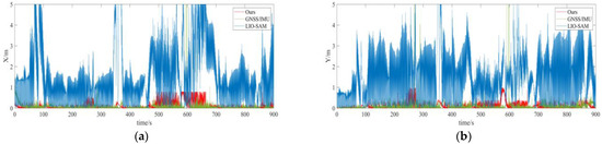 As shown in Figure 5, the absolute error comparison chart of the X-axis and Y-axis of the algorithm proposed in this paper, the GNSS/IMU integrated navigation algorithm, and the LIO-SAM laser mileage calculation method with the true value are shown. Since the positioning error of the GNSS/IMU algorithm under the viaduct is too large, in order to clearly show the effect of the algorithm in this paper, the positioning error within a 5 m range on the X and Y axes is selected. The error graph can more clearly reflect the positioning accuracy and robustness of the three algorithms.