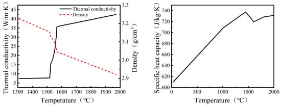 The EBSM process exhibits severe temperature fluctuations and a wide range of variations, causing the metal material to undergo transitions from a powder state to a liquid state and then from a liquid state to a solid state. The thermal properties of the material also change accordingly. Due to the different internal heat transfer mechanisms, the thermal properties of powder materials, especially their thermal conductivity, differ significantly from those of bulk materials. Based on Kan’s article [31], using the Pandat 2022 simulation software, the relationship between the temperature variation and the basic physical property parameters can be calculated as shown in Figure 1.