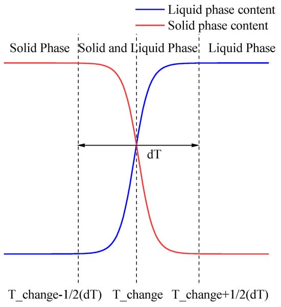 Select the phase change material interface in COMSOL 6.0, and define the phase change function α(T) in the interface as the Heaviside function. Set the solid-liquid phase change temperature T_change, the phase change temperature interval dT, and the latent heat of solidification dH. Simulate the solid–liquid phase change using the apparent heat capacity method. The graph of the phase change function is shown below (Figure 2).